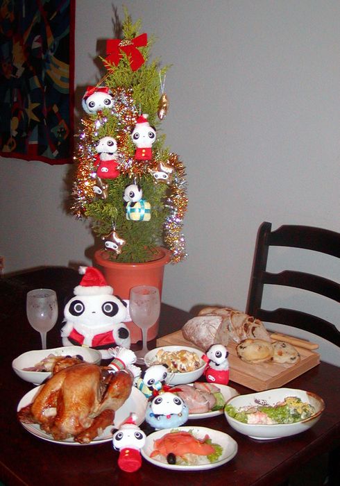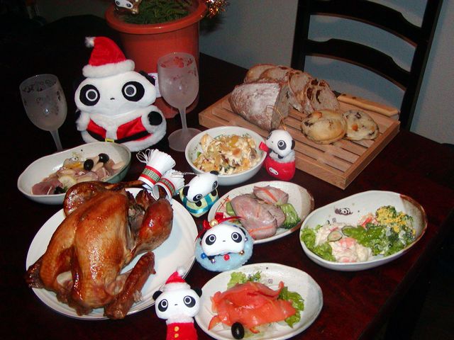さあさあ ご馳走食べよう! おいしそうだね。 まずはシャンパンと赤ワインを開けてっと・・・あ シャンパン用のパーティグラス(ゴールド)さん 冷凍庫で冷やしたままだ。たれか出してきて。 今年は七面鳥が乗っているお皿とパン切り台以外は全部、食器(和食器シリーズや枝豆セット皿)もグラス(グラスワインセット)もたれぱんだシリーズで統一してみました ^-^ |