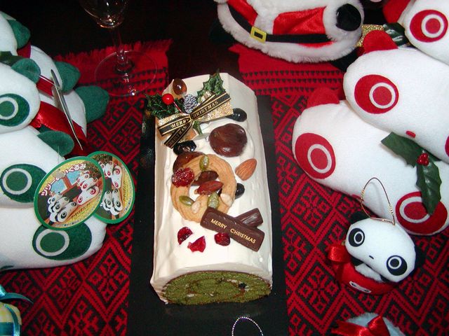 食事の後は お待ちかねのクリスマスケーキ! 今年は 和風。黒豆がいっぱい入った抹茶のロールケーキです。なんだかとてもヘルシーな感じ。 ケーキと聞いて ツリーたれさんたちまでやってきました。みんなで一緒に いっぱい食べようね。 (サンタぬいぐるみ(2003)、クリスマス オーナメント、 ツリーぬいぐるみ(緑・赤)、 サンタさんの左隣にパーティグラスが見えます) |
