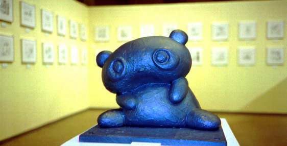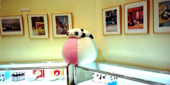 | 中は、「たれぱんだ」「たれごよみ」の原画でいっぱいです。真中には、ソファをはさんで銅像たれがふたれ向かい合っています。銅像の向こうの壁に、原画が並んでいるのが見えます。 |