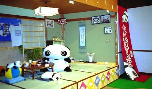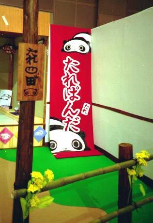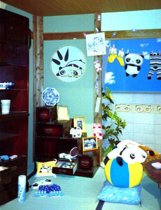 向こうの壁には、おじいさんとおばあさんの写真、たれ一家の写真、掛け軸や標語などが飾ってあります。 あぁっ、花瓶にいけてある花には花たれぱんだがいる! その横(掛け軸の下)には2000年記念アイテムが飾ってある! うーん、何だか、ワクワクしてきた〜