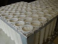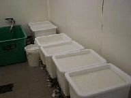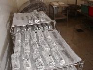 まずチーズ作りについて見せていただきました。小部屋に、凝乳酵素の入ったミルクがずらっと並んでいます。(左の写真) 型入れは1日1回。右は、型入れを終わったところの写真です。2日間おくと、高さが3分の2くらいになるそうです。 |