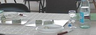 シンプルな机がずらーっと並び、机の上には評価の終わったチーズや水があります。審査は、まず種類ごとに行なわれ、さらに、主要な審査員が集まって、全体での順位を決めるのだそうです。それぞれのチーズを、外観4点、切り口の状態4点、味4点の合計12点満点で評価し、順位づけするとのこと。