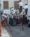 バスク地方のチーズやお菓子をうるお店の前では、民族衣装を来て、高い竹馬に乗った人たちがいました。(バスク地方のシンボル、ベレー帽をかぶっています。) |