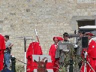 左:赤いマントを着たのが地元のチーズ協会(関係者)の人、緑の縞の服の人は楽士さんです。