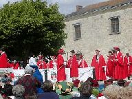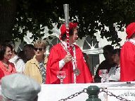 中央:シュバリエの称号をもらう人の名前が呼ばれ、壇上にあがります。赤いマントをつけ、白いナプキンをつけ、チーズを食べワインを飲み、誓いの言葉を復唱します。