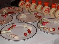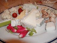 左:ディナーのメインはやはりチーズ! 周りに野菜の置いてあるお皿を取り (野菜が全部生なのには、ちょっとびっくり。セロリはともかく、ラディッシュ、マッシュルーム、カリフラワーなど全部そのまま)