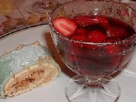 右:デザートはケーキと苺。苺には、当地風に、シノン(赤ワイン)をたっぷりかけてもらいました。