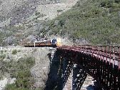 橋のたもとで停まったので(左)、希望者は各自鉄橋を歩いて渡り(中央)、峡谷や走ってくる列車の写真を撮ることができます。